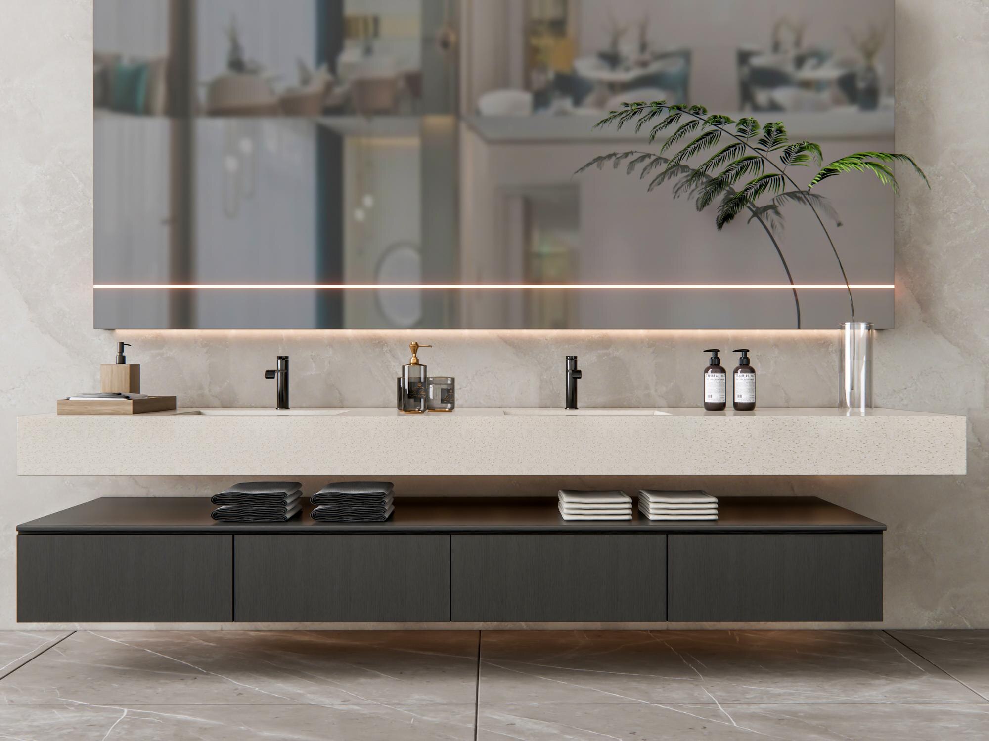 Every project is unique, and Stonim surfaces offer the flexibility to cater to your specific needs. Whether you need a custom size or a special finish, these surfaces are adaptable to meet your design challenges. Explore custom vanity top options here.